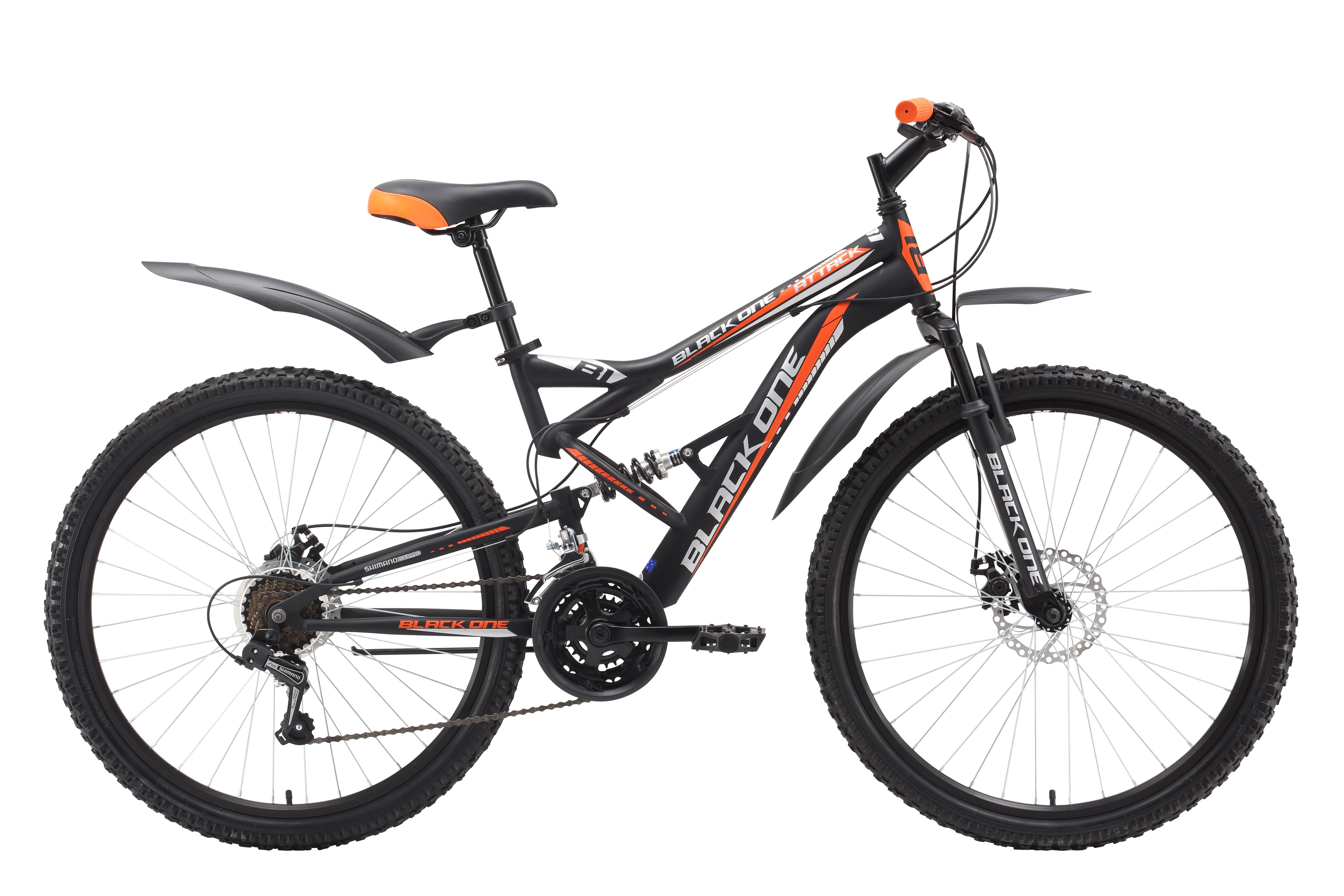 Стальная рама двухподвеса Black One Attack имеет особенность – верхняя труба расположена ниже, чем у других моделей. Это делает велосипед более безопасным. К тому же, рама имеет усиленный рулевой узел, за счёт изгиба нижней трубы. Благодаря перечисленным особенностям, двухподвес Black One Attack можно считать более «спортивным», чем остальные велосипеды двухподвесы Black One. Дисковые тормоза и 18 передач позволяют поддерживать удобный скоростной режим. Подбор скоростей выполняется переключателями Shimano Revo Shift. Двухподвес Black One Attack имеет стандартную комплектацию быстросъёмными крыльями и подножкой.